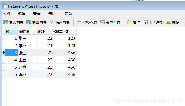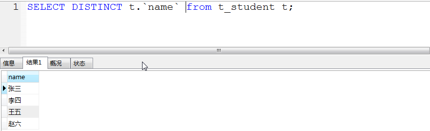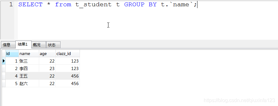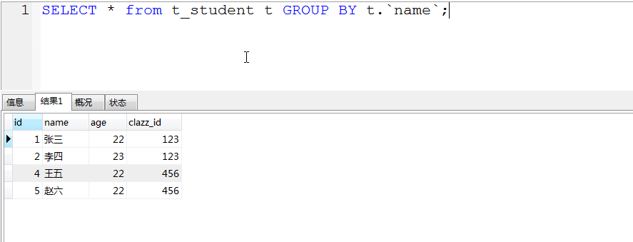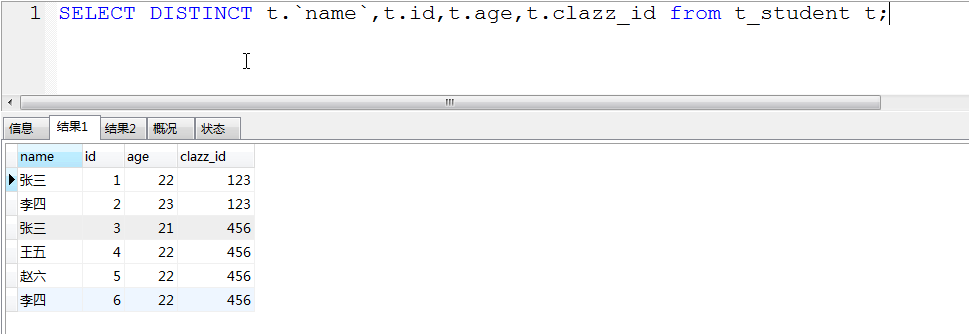 SELECT DISTINCT t.`name`,t.id,t.age,t.clazz_id from t_student t;