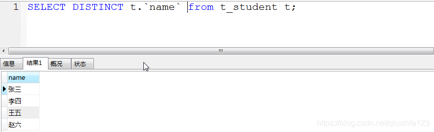 可以发现,并没有达到去重的目的,因为DISTINCT是对记录去重,只有所有查询字段都相同才算是重复的,如果只查name是OK的,但是实际中,不可能只查name: