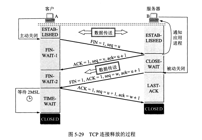4.B要发给A的数据发送完毕了,B发出请求释放连接b2,FIN=1,seq=w,ack=u+1 ;(A:FIN-WAIT-2,B:LAST-ACK)