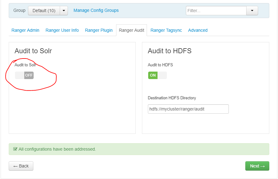 8. 未安装solr,关闭此选项,需要安装时参考https://docs.hortonworks.com/HDPDocuments/HDP2/HDP-2.5.0/bk_security/content/ranger_audit_settings.html