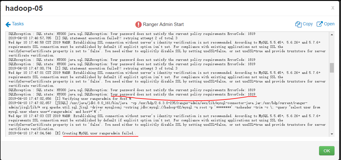 问题2. resource_management.core.exceptions.ExecutionFailed: Execution of '/usr/java/jdk1.8.0_161/bin/java -cp '/usr/hdp/current/ranger-tagsync/lib/*' org.apache.ranger.credentialapi.buildks create tagadmin.user.password -value '[PROTECTED]' -provider jceks://file/usr/hdp/current/ranger-tagsync/conf/rangertagsync.jceks' returned 1. Error: Could not find or load main class org.apache.ranger.credentialapi.buildks