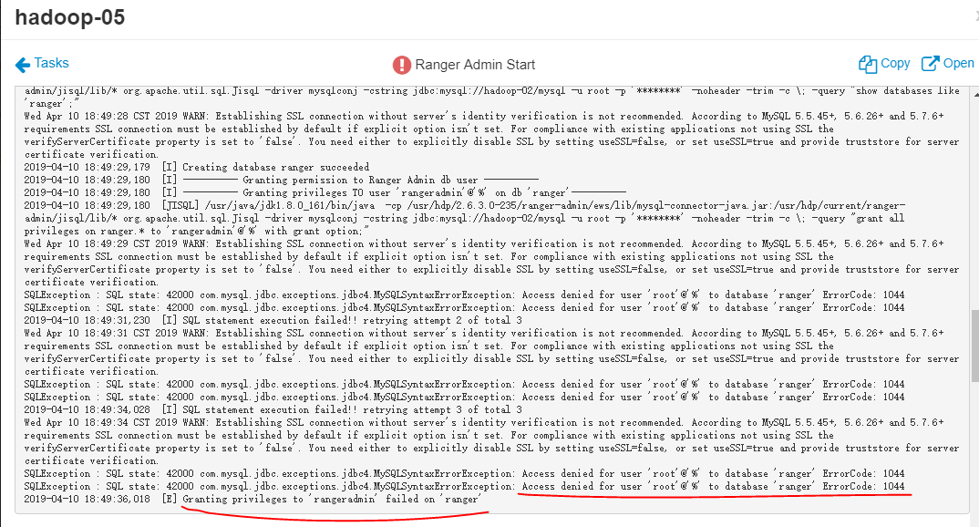 重装成功,启动报错:Access denied for user 'rangeradmin'@'Hbase-01' (using password: YES)