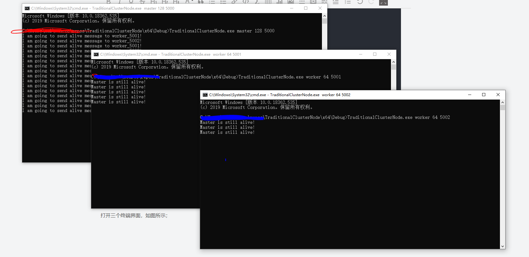 第一个是master节点,后2个是worker节点,master节点以一定频次向worker报告自己的存活信息。