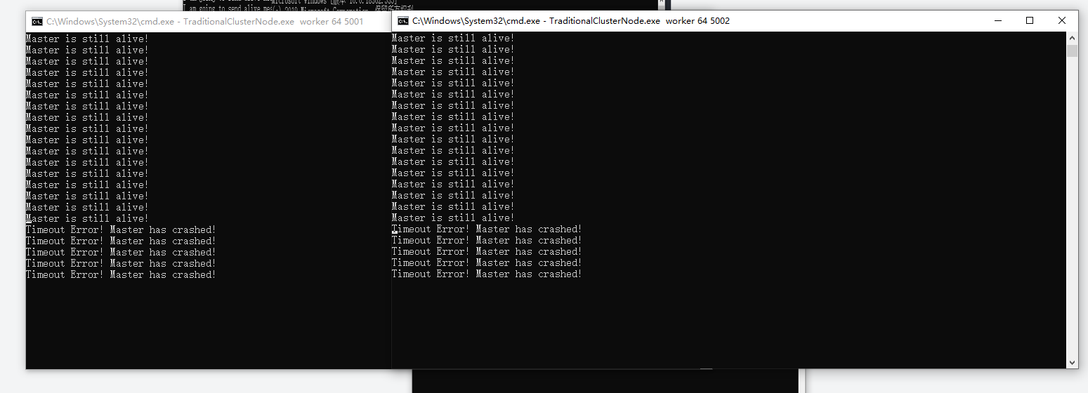 当我们把master程序关闭(模拟Master崩溃),worker节点超时未收到Matser信息,会得知master崩溃。