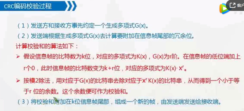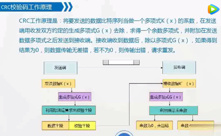 (3)再把这个校验码附加在原数据帧(就是m位的帧,注意不是在后面形成的m+k-1位的帧)后面,构建一个新帧发送到接收端,最后在接收端再把这个新帧以“模2除法”方式除以前面选择的除数,如果没有余数,则表明该帧在传输过程中没出错,否则出现了差错。