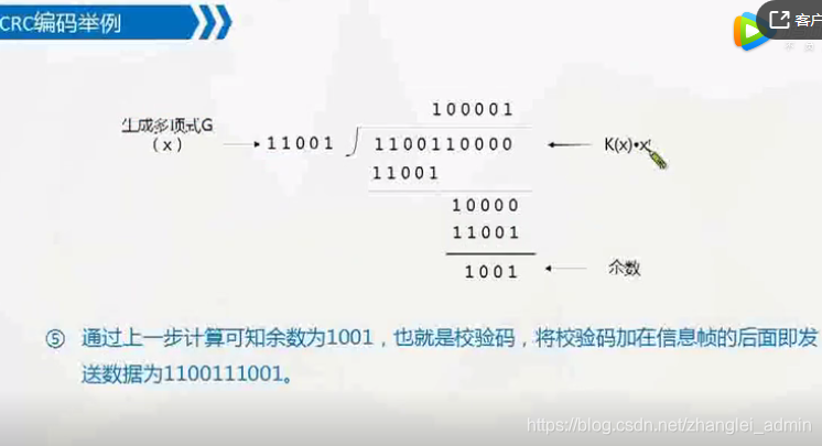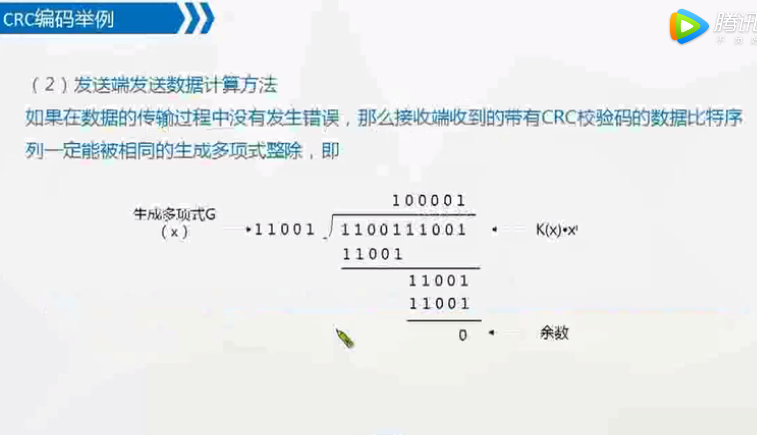 (4)当以上新帧到达接收端后,接收端会把这个新帧再用上面选定的除数11001以“模2除法”方式去除,验证余数是否为0,如果为0,则证明该帧数据在传输过程中没有出现差错,否则出现了差错。