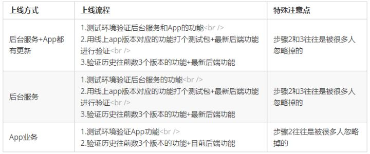App业务必定要靠后台服务的支持,上线的时候如果涉及到后台业务更新,这时候就要特别注意了,因为app上线有个审核过程,因此不可避免的后端服务要先上线,所以要提前验证下最新后台服务对当前线上app版本是否支持,另外有些用户可能还不会实时更新app版本,所以最好对app当前往前数历史3个版本的功能都进行下验证,否则新服务上了以后很容易造成线上bug,这个是大家需要格外注意的。