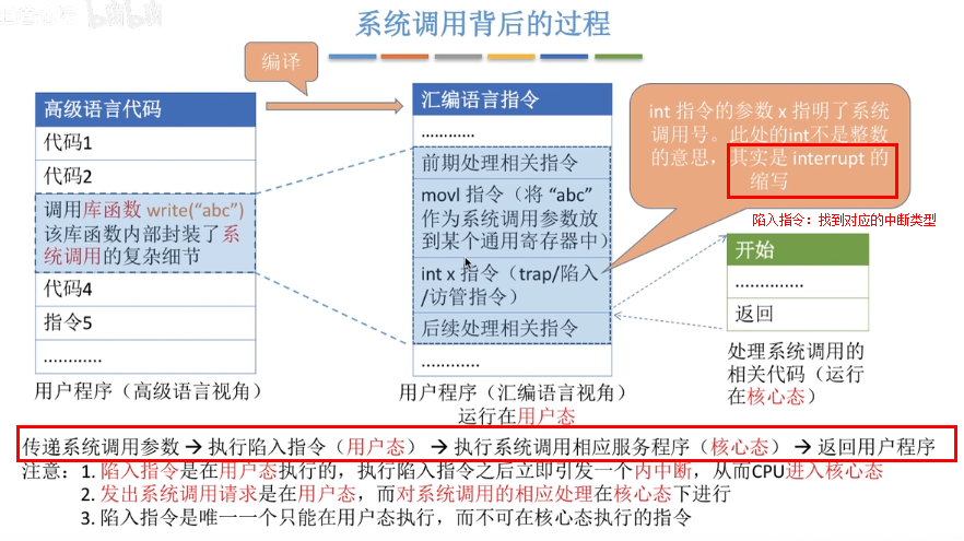 陷入指令的发出实在用户态,操作系统调用相应处理实在核心态