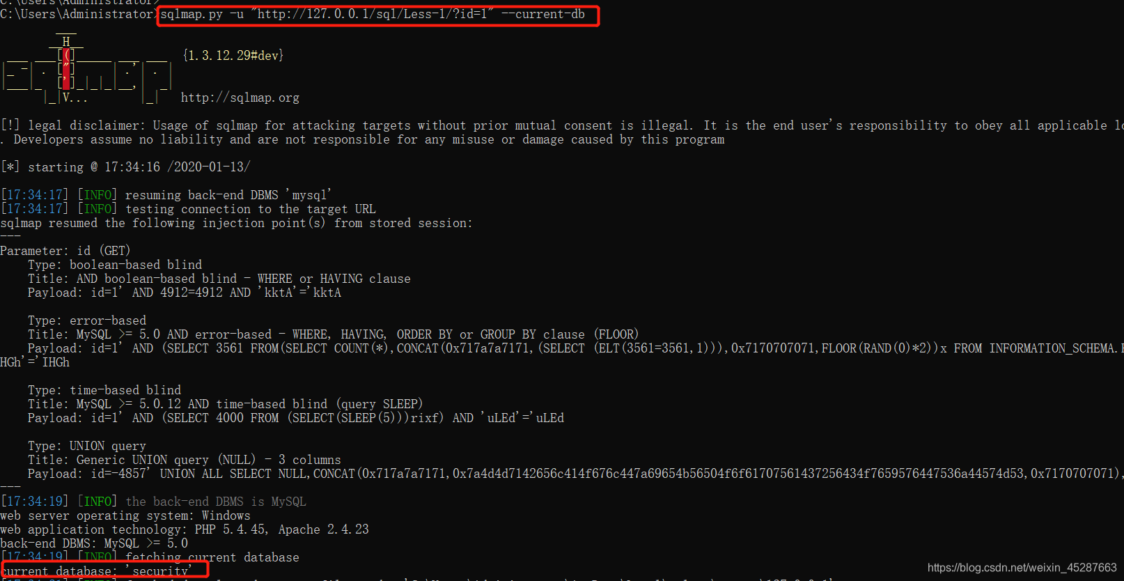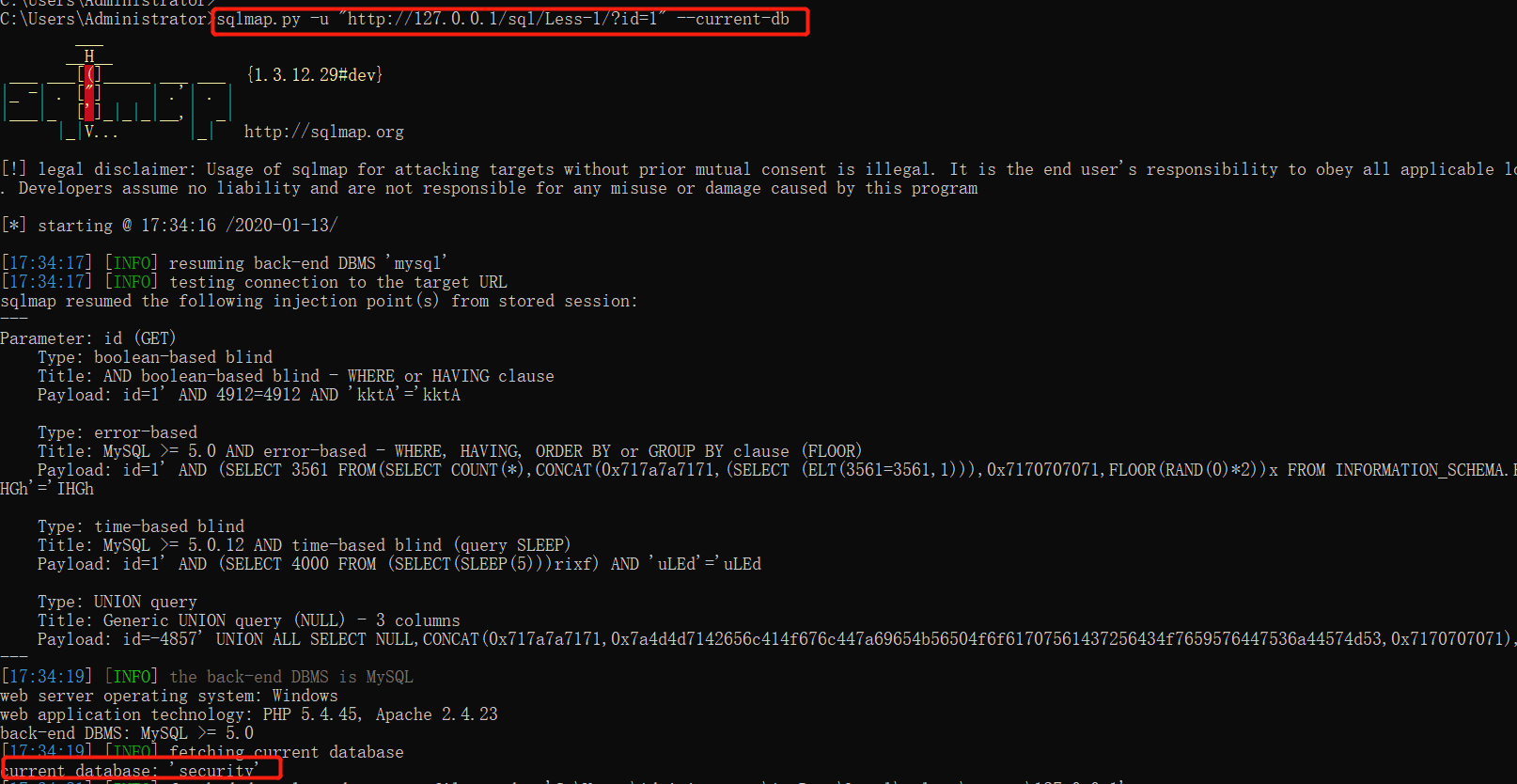 sqlmap.py -u "http://127.0.0.1/sql/Less-1/?id=1" --current-db