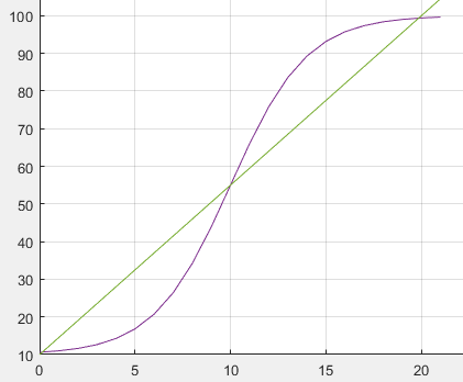 其中flex参数是用来调节区间范围的,使用该方法规划的速度曲线关于中心点对称。比如当𝑣s=10,𝑣e=100,2n=2,flex=5时,规划的速度曲线如下图所示。由于关于中心点对称,所以S速度曲线(图中紫色曲线)包围的面积等价于从初速度𝑣s按恒定加速度加速到𝑣e的曲线(图中绿色曲线)所包围的面积。