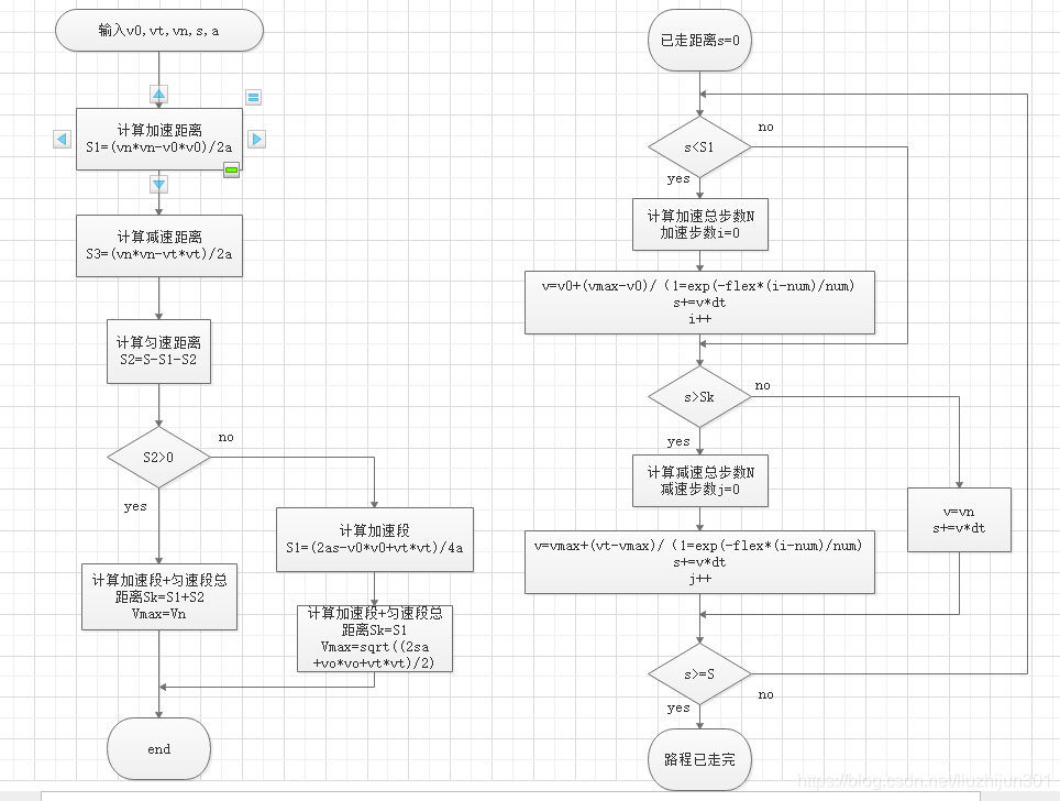 所以可以先按梯形曲线规划速度曲线,然后对于其中的加速度段和减速度段,分别进行按照式(5-2)进行s速度曲线规划。则已知初速度𝑣s,末速度𝑣e,线段距离s,加速度a,进行s曲线速度规划步骤为: