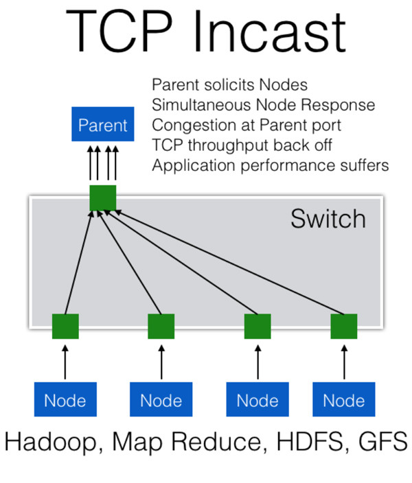 然而业务本身在网络中分布是不可控的,因此在实际网络流量模型中不可避免会出现多对一的通信模式,即 Incast模型。下图即典型的Incast通信模型:
