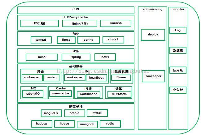 整个架构是分层的分布式的架构,纵向包括CDN,负载均衡/反向代理,web应用,业务层,基础服务层,数据存储层。水平方向包括对整个平台的配置管理部署和监控。下面是对架构的剖析。