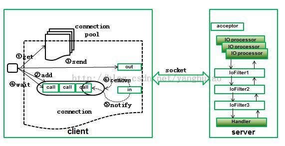 - 客户端和服务器端维护的是长连接,可以减少每次请求建立连接的开销,在客户端对于每个服务器定义一个连接池,初始化连接后,可以并发连接服务端进行rpc操作,连接池中的长连接需要心跳维护,设置请求超时时间。对于长连接的维护过程可以分两个阶段,一个是发送请求过程,另外一个是接收响应过程。在发送请求过程中,若发生IOException,则把该连接标记失效。接收响应时,服务端返回SocketTimeoutException,如果设置了超时时间,那么就直接返回异常,清除当前连接中那些超时的请求。否则继续发送心跳包(因为可能是丢包,超过pingInterval间隔时间就发送ping操作),若ping不通(发送IOException),则说明当前连接是有问题的,那么就把当前连接标记成已经失效;若ping通,则说明当前连接是可靠的,继续进行读操作。失效的连接会从连接池中清除掉。每个连接对于接收响应来说都以单独的线程运行,客户端可以通过同步(wait,notify)方式或者异步进行rpc调用,序列化采用更高效的hession序列化方式。