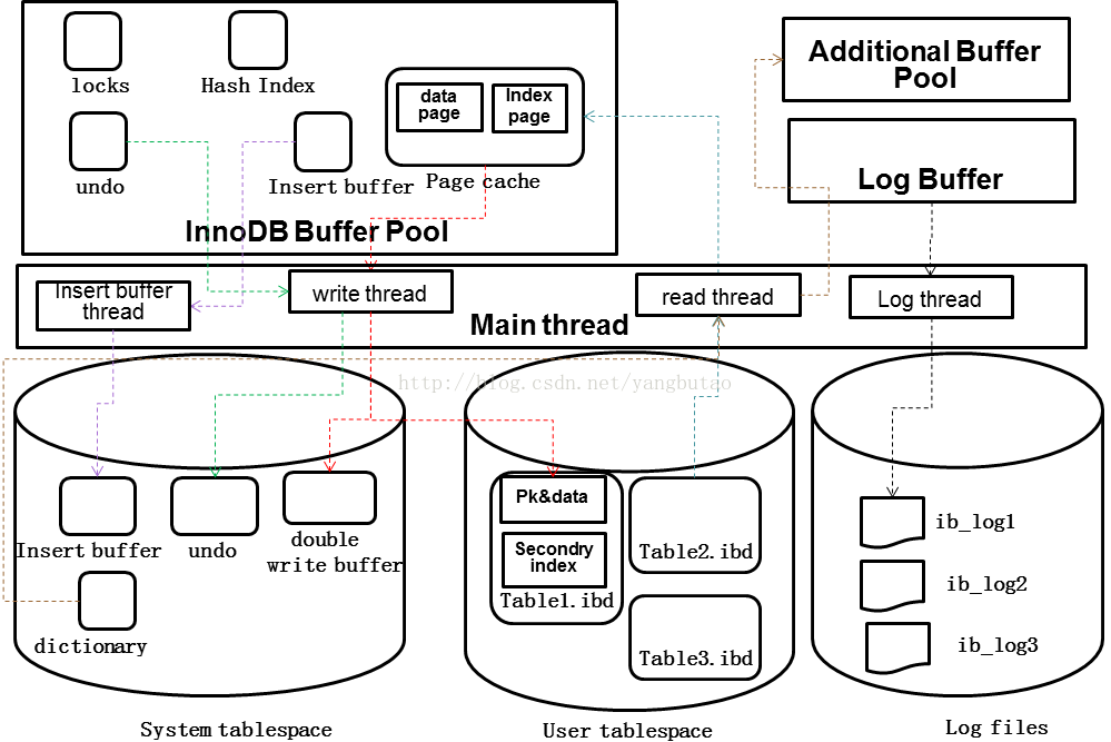 在数据结构方面,innodb包括表空间、段、区、页/块,行。索引结构是B+tree结构,包括二级索引和主键索引,二级索引的叶子节点是主键PK,根据主键索引的叶子节点指向存储的数据块。这种B+树存储结构可以更好的满足随机查询操作IO要求,分为数据页和二级索引页,修改二级索引页面涉及到随机操作,为了提高写入时的性能,采用insert buffer做顺序的写入,再由后台线程以一定频率将多个插入合并到二级索引页面。为了保证数据库的一致性(内存和硬盘数据文件),以及缩短实例恢复的时间,关系型数据库还有一个checkpoint的功能,用于把内存buffer中之前的脏页按照比例(老的LSN)写入磁盘,这样redolog文件的LSN以前的日志就可以被覆盖了,进行循环使用;在失效恢复时,只需要从日志中LSN点进行恢复即可。