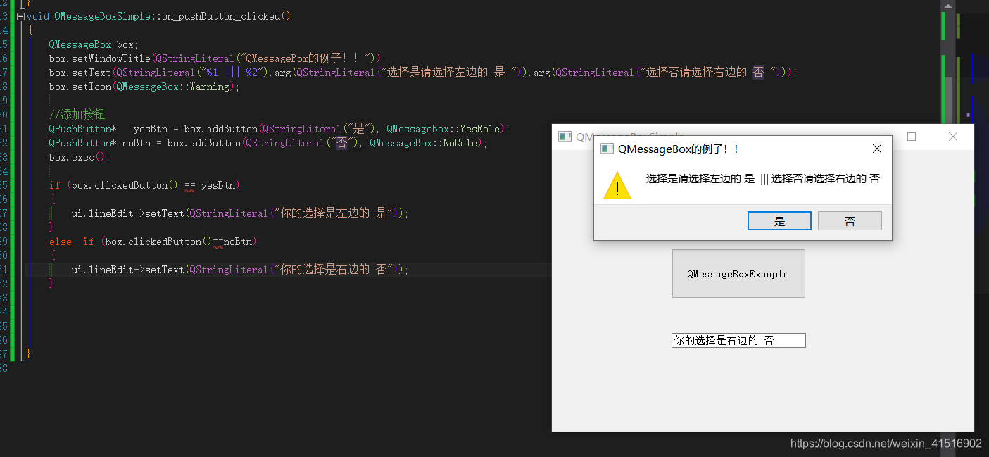 box.setText(QStringLiteral("%1 ||| %2").arg(QStringLiteral("选择是请选择左边的 是 ")).arg(QStringLiteral("选择否请选择右边的 否 ")));