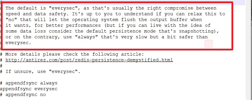 它的特点持久化的频率非常高了,默认每秒持久化1次。每一秒内将最新的写入与删除的命令进行持久化。