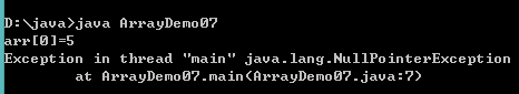通过上图所示的运行结果可以看出,上述代码中第4、5行代码都能通过变量arr正常地操作数组。第6行代码将变量置为null,当第7行代码再次访问数组时就出现了空指针异常NullPointerException。