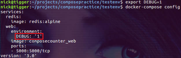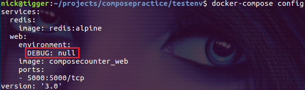 这种情况下,如果没有在当前的 shell 中导出环境变量 DEBUG,compose file 中会把它解释为 null: