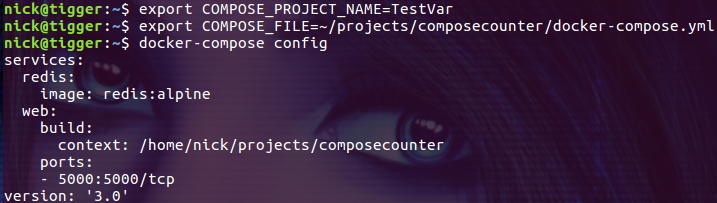 $ export COMPOSE_PROJECT_NAME=TestVar $ export COMPOSE_FILE=~/projects/composecounter/docker-compose.yml