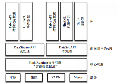 上图是Flink 技术栈的核心组成部分。值得一提的是,Flink 分别提供了面向流处理 的接口(DataStream API)和面向批处理的接口(DataSet API)。因此,Flink 既 可以完成流处理,也可以完成批处理。Flink 支持的拓展库涉及机器学习(FlinkML)、 复杂事件处理(CEP),以及图计算(Gelly),还有分别针对流处理和批处理的 Table API