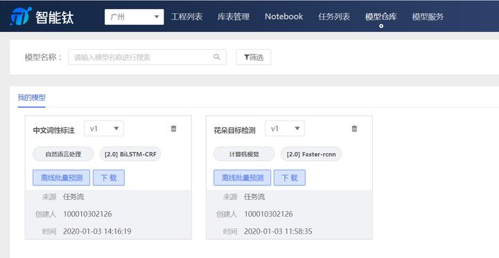 模型仓库页面用于管理所有保存的模型。支持以下功能: