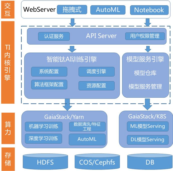 TI-ONE采用经典的分层架构模型,从上到下分别是交互层、TI内核引擎层、算力层和存储层。