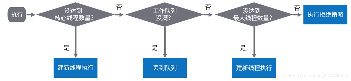 线程池达到核心线程数量,就判断工作队列是否已满,如果已满,就判断是否达到最大线程数量,如果没达到,就建新线程执行任务