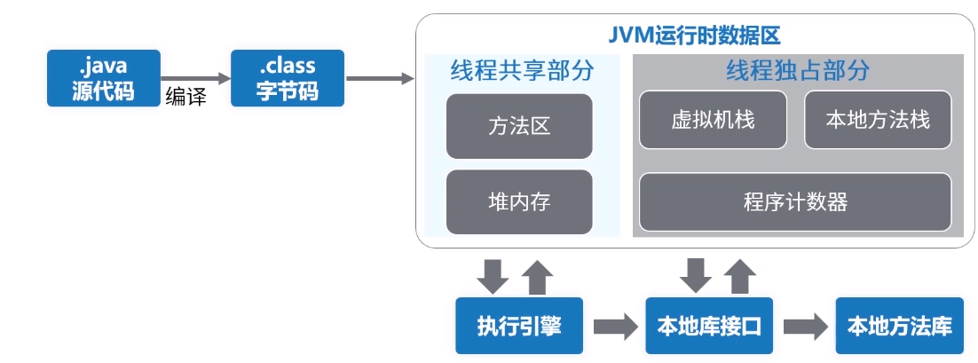 线程独占(工作区):虚拟机栈、本地方法栈、程序计数器