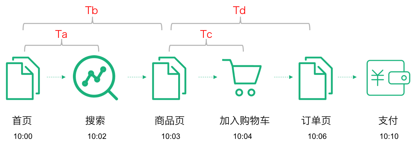 可以看到,用户的行为里既有查看首页、商品页、订单页等页面浏览型动作,也有如点击搜索、点击加入购物车和支付等交互动作。同时,不同的动作间,发生的时间间隔不一。