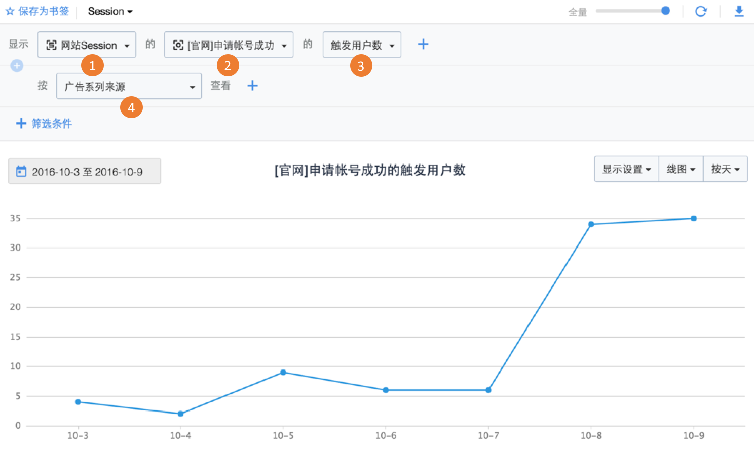营销推广中一个非常典型的需求就是需要知道不同渠道带来的注册、购买等转化情况,该需求本质上,就是需要界定 Session,然后按渠道属性查看注册、购买等事件的转化数量: 1.1 选择创建的 Session