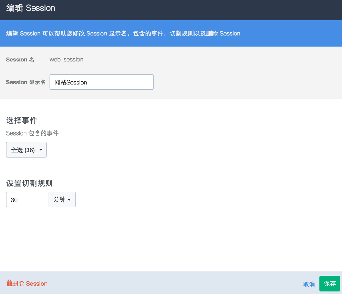 - 可以根据自身业务,灵活选择想要加入 Session 中的事件:可以是全部事件,可以只包含浏览页面,也可以任意选择添加。