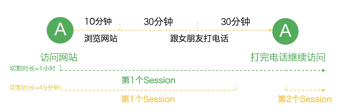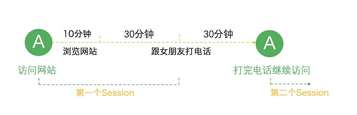 用户A从访问网站开始计第一个Session,用户访问10分钟之后跟女朋友打了一个小时的电话,即用户从第10分钟开始,在网页已没有任何行为累计一个小时,根据Session切割规则,Session会在用户A在跟女朋友打电话第30分钟的时间切割,当用户打完电话继续访问网站时,Session另外计,如下图所示
