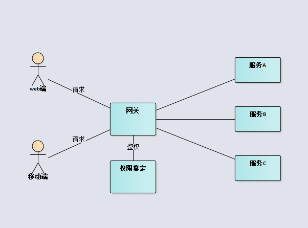 第一种是使用先在网关进行权限的判断,此用户有这个操作的权限,再进行查询,查询时根据参数进行SQL的拼接。网关鉴定是否能访问以及转发请求,对SQL的拼接和处理在各微服务自己内部进行,服务A/B/C都需要自己写需要查询的参数。如下图所示