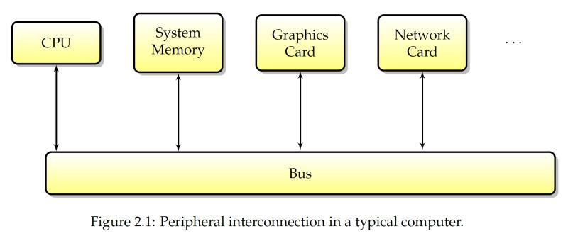 Today all computers are architectured the same way: a central processor and a number of peripherals. In order to exchange data, these peripherals are interconnected by a bus over which all communications go. Figure outlines the layout of peripherals in a standard computer.