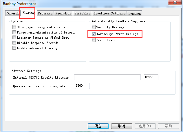 将“JavaScript Error Dialogs” 打勾,意思是隐藏javascript的报错对话框。