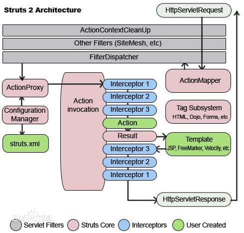Struts2框架在运行时,请求会被StrutsPrepareAndExecuteFilter拦截,会根据请求,去strtus.xml文件中查找到匹配的action,在action执行前,会走一些interceptor,默认执行的拦截器是struts-default.xml文件中定义的。