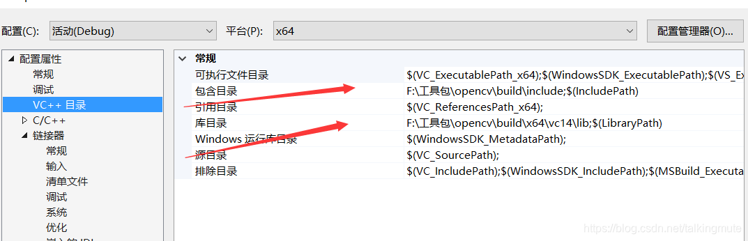 这是vs2015创建工程的属性配置,包含目录和库目录。因为是vs2015,所以库目录要选vc14,如是vs2017,要选vc15。