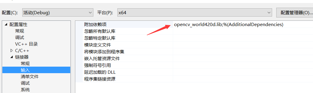 还有就是链接器-输入,要把lib库文件输入,因为是debug模式,所以是opencv_world420d.lib。如是release模式,需要输入opencv_world420.lib
