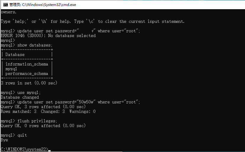 mysql> update user set password="你的新密码" where user="root";