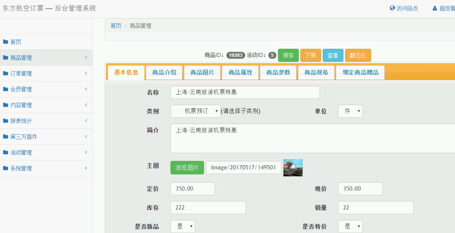 管理员登录进入管理导航界面,可以管理机票、订单、会员等