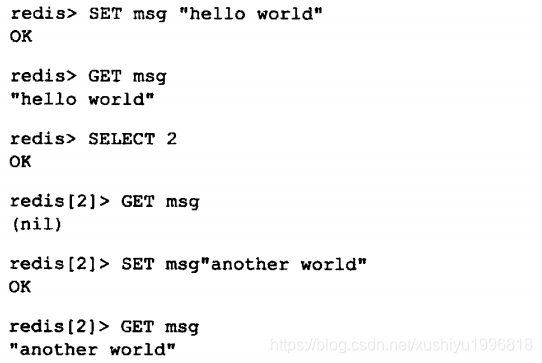 以下代码示例演示了客户端在0号数据库设置并读取键msg, 之后切换到2号数据库 并执行类似操作的过程: