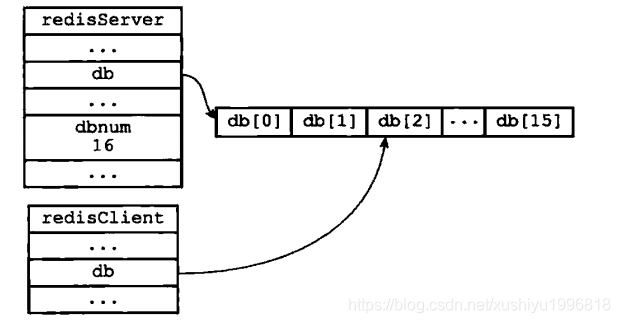 在服务器内部,客户端状态redisClient结构的db属性记录了客户端当前的目标数 据库,这个属性是一个指向redisDb结构的指针: