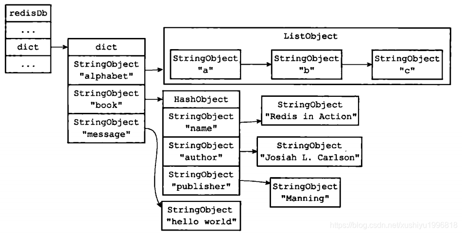 message是一个字符串键.键的名字是一个包含字符串"message"的字符串对象, 键的值则是一个包含字符串"hello world"的字符串对象。