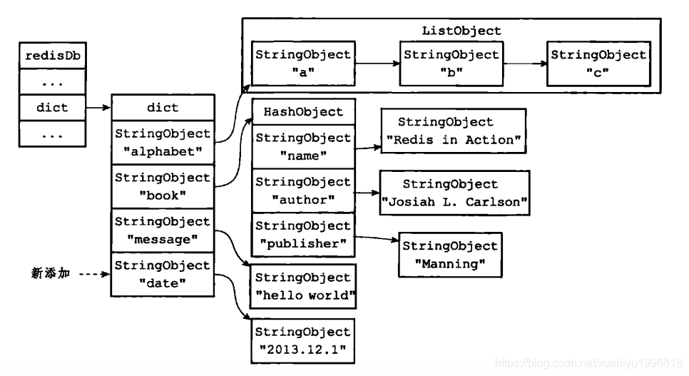 键空间将添加一个新的键值对,这个新键值对的键是一个包含字符串"date"的字符串对 象,而键值对的值则是一个包含字符串"2013.12.1"的字符串对象,如图