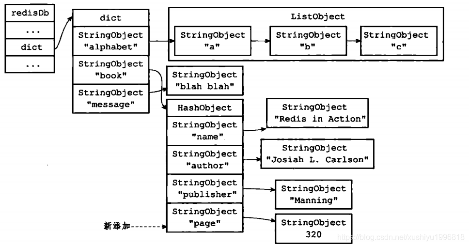那么键空间中book键的值对象(一个哈希对象)将被更新,新的键值对page和320会 被添加到值对象里面,如图