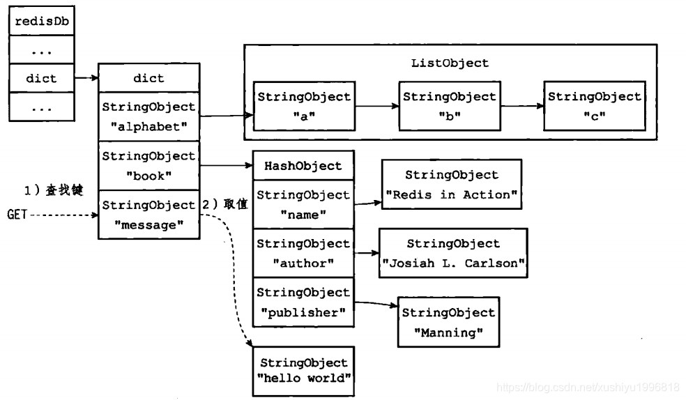 GET命令将首先在键空间中查找键message, 找到键之后接着取得该键所对应的字符串对 象值,之后再返回值对象所包含的字符串"hello world", 取值过程如图