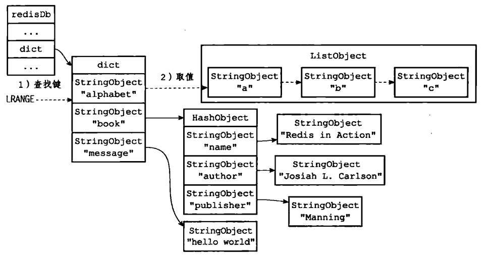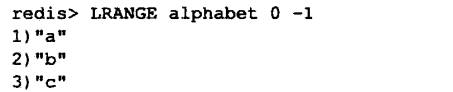 LRANGE命令将首先在键空间中查找键alphabet,找到键之后接着取得该键所对应的列 表对象值,之后再返回列表对象中包含的三个字符串对象的值,取值过程如图