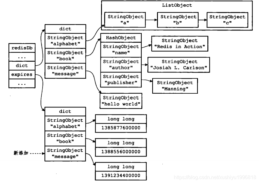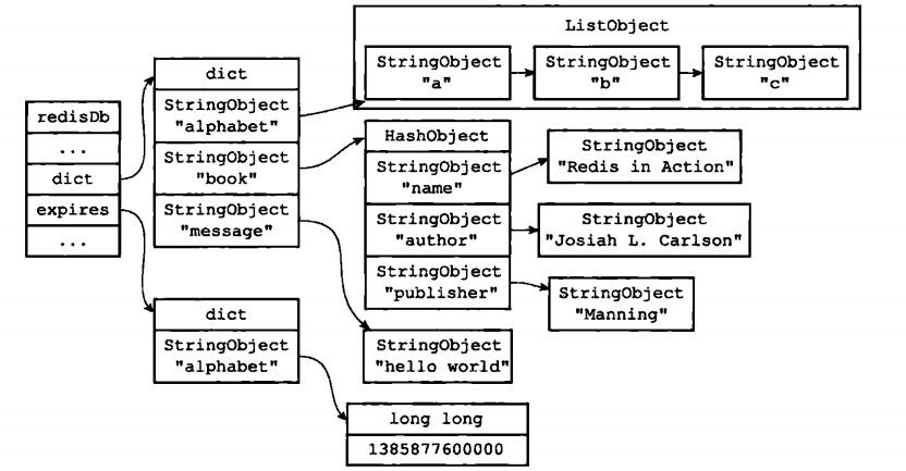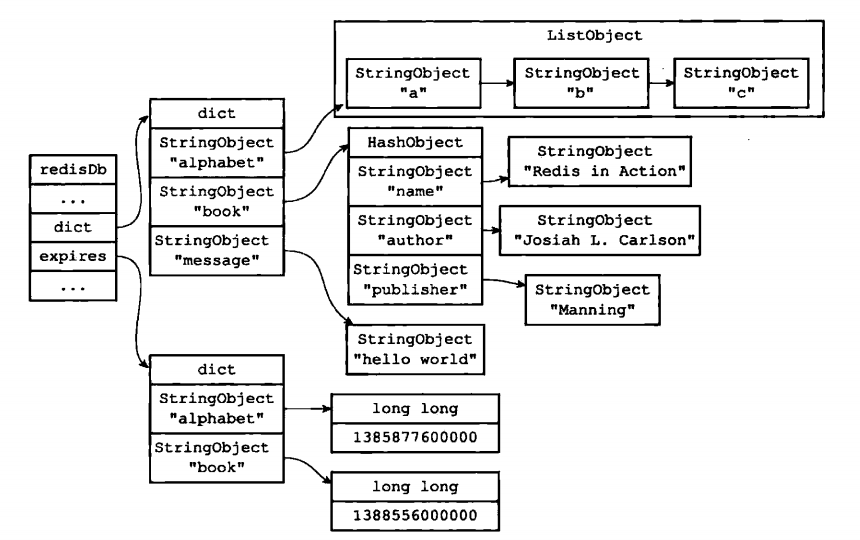注意,为了展示方便,图的键空间和过期字典中重复出现了两次alphabet键对象和book键对象。在实际中,键空间的键和过期字典的键都指向同一个键对象,所以不会出现 任何重复对象,也不会浪费任何空间。
