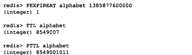 如果当前时间为1383282000000 (2013年11月1日零时),那么对键alphabet 执行PTTL命令将返回2595600000, 这个值是通过用alphabet键的过期时间减 去当前时间计算得出的: 1385877600000 - 1383282000000 = 2595600000。